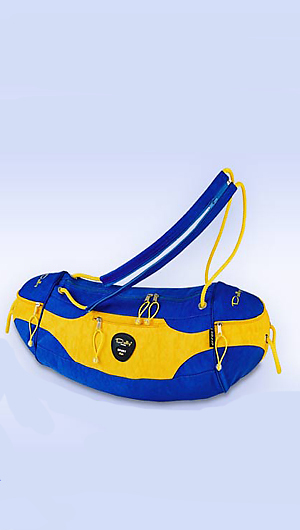 Спортивная сумка имеет необычный дизайн в форме "банана". Одно основное отделение, боковые карманы в форме полусфер с толстым шнурком. Верхняя ручка с разъемной молнией на два плеча.